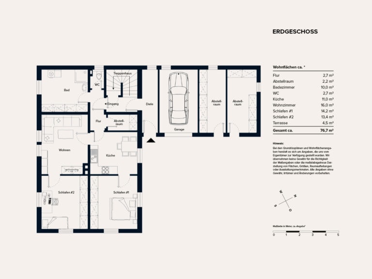 Im Außenbereich stehen ein großzügiger Garten, eine Garage, zwei Außenstellplätze sowie ein Nebengebäude mit zwei separaten Abstellräumen zur Verfügung.