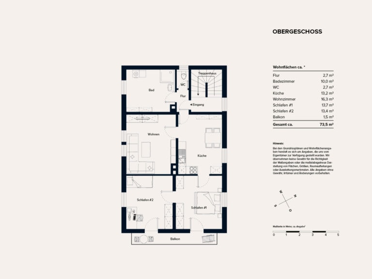 Die Wohnung im Obergeschoss ist nahezu identisch geschnitten mit ca. 73 m² Wohnfläche, verfügt jedoch über einen Balkon, der von beiden Schlafzimmern aus zugänglich ist. Eine Sanierung des Balkons ist empfehlenswert.