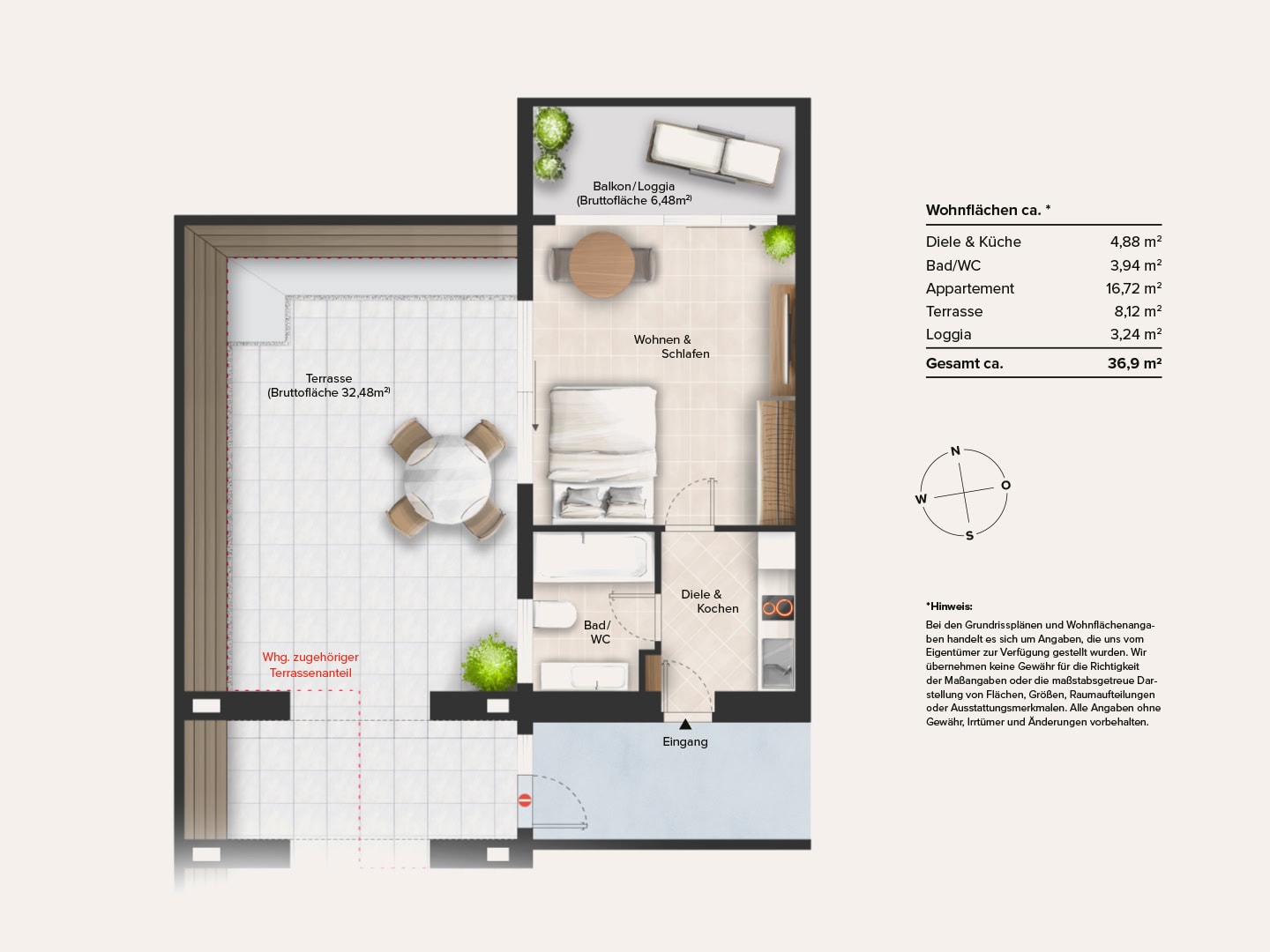 Auf rund 37 m² erwarten Sie ein Wohn-/Schlafbereich mit Zugang zu zwei großzügigen Außenflächen – eine Loggia und ein Terrasse mit über 30 m² Bruttofläche – sowie eine voll ausgestattete Einbauküche und ein modernes Badezimmer. Große Fensterflächen, pflegeleichte Fliesenböden und eine übergroße, elektrische Markise sorgen für hohen Wohnkomfort.